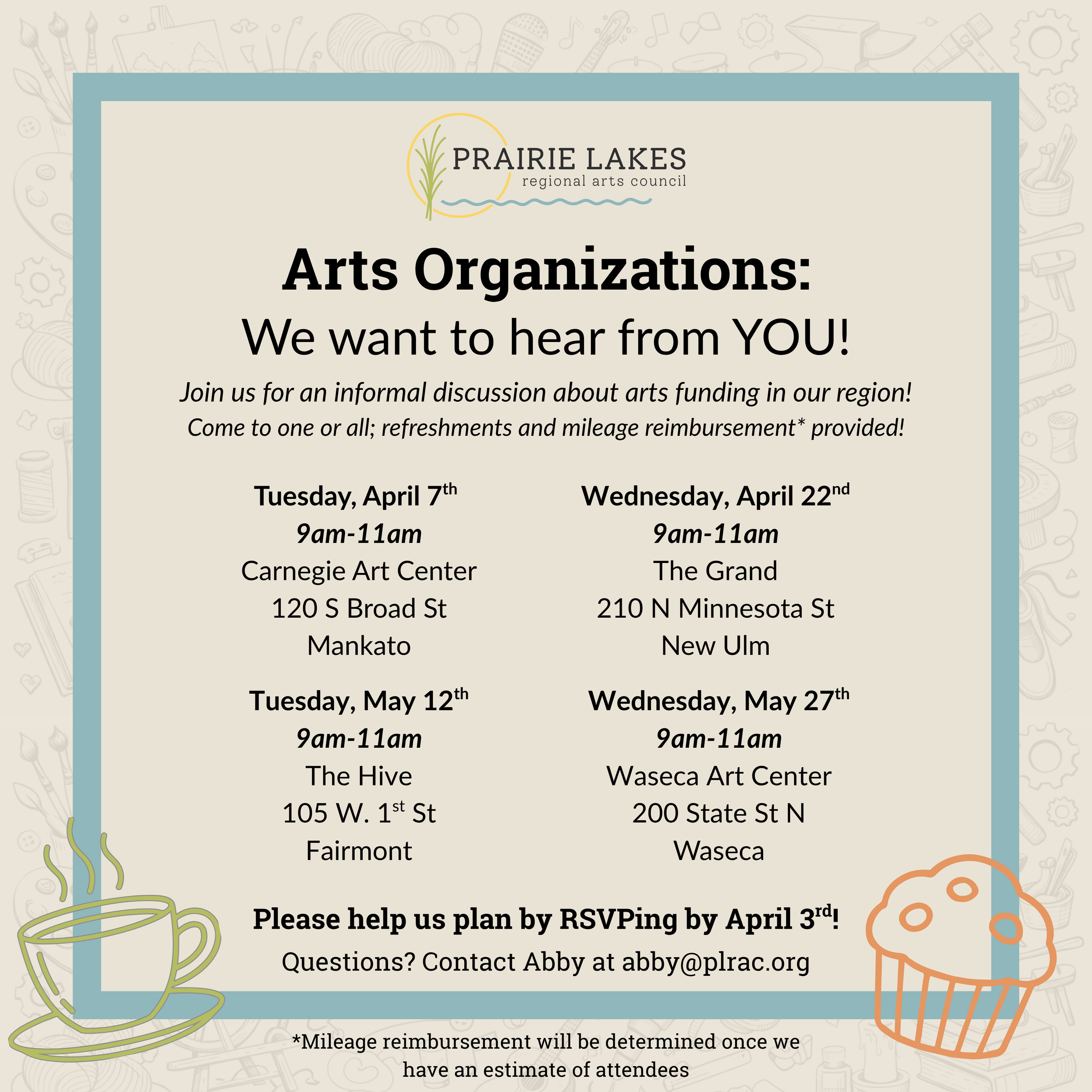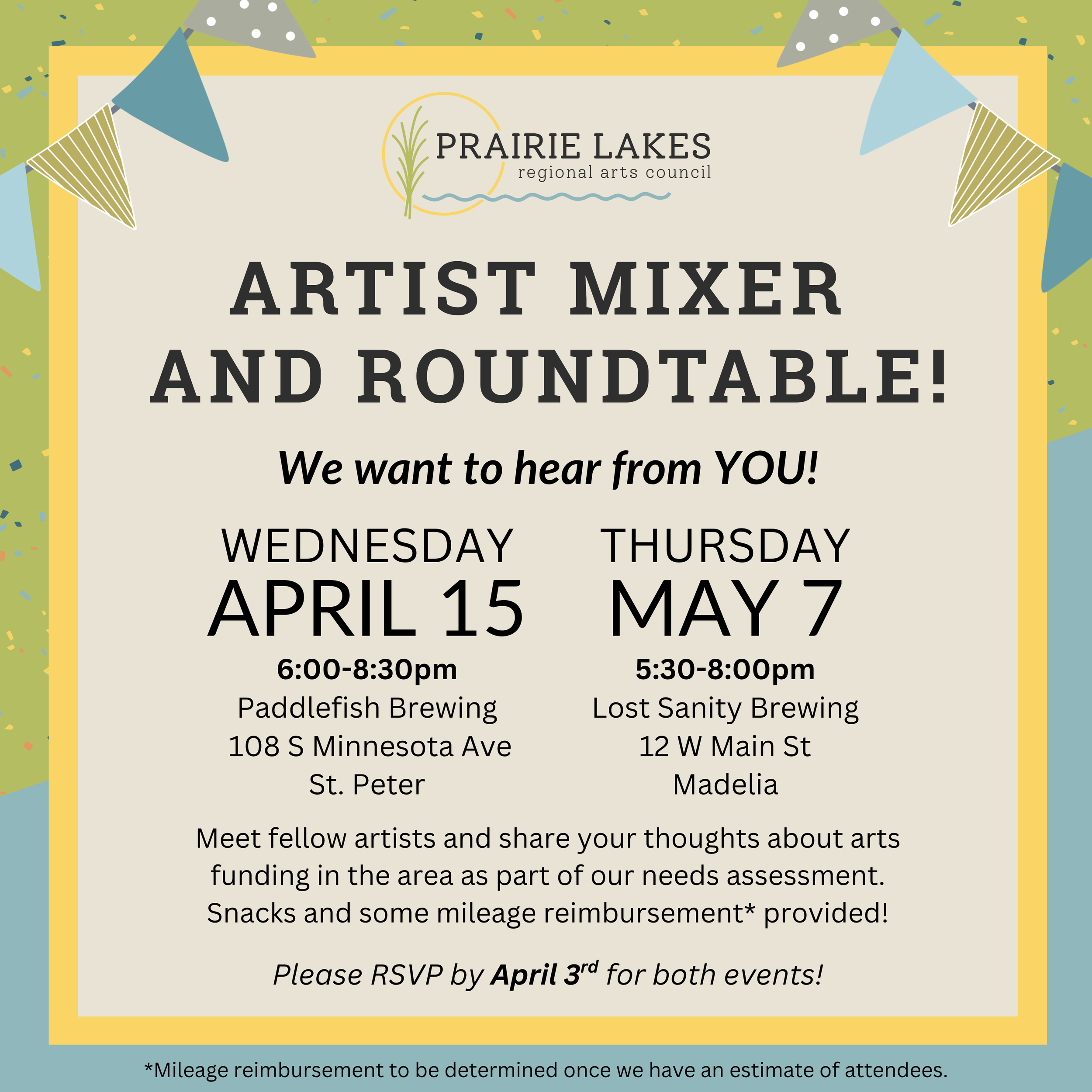 Share your thoughts and meet other local artists at our upcoming Artist Mixer and Roundtable events!